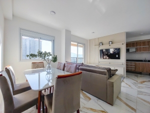 O imóvel conta com 03 dormitórios sendo 01 suíte. A locação inclui alguns itens, entre eles estão luminárias, bancada, bancada pia, aquecedor, armários, gabinetes, rack, espelhos, box, guarda Roupa, mesa de cabeceira, geladeira, fogão, sacada c/ vidros, piso laminado e gesso com sanca nos tetos.